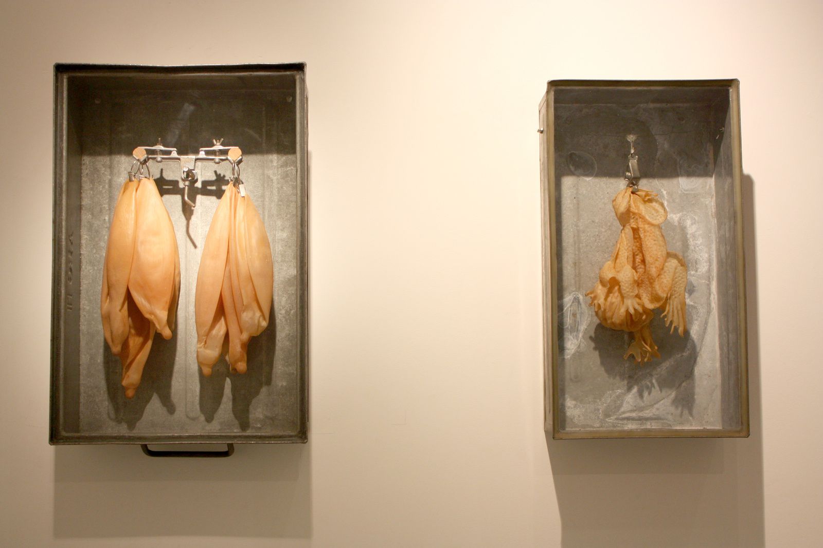 L'espace restreint d'une galerie ne lui permettant pas ces mises en scène macabres et envoûtantes, l'exposition présente des citations de ces mondes, des fragments. Ainsi que le produit des dernières recherches de l'artiste dans lesquelles le monde des humains commence à apparaître.