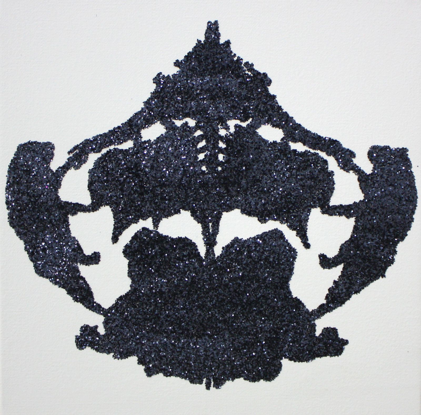 En face, Pascal Lièvre reprend les dix figures du test de Rorschach en paillettes noires. Mis au point en 1921, le test de type projectif suppose une évaluation psycho-logique par l’interprétation des taches d’encre. La lecture des formes apporterait ainsi des clés de compréhension d’une personnalité. Un cheminement intime et subjectif présent dans les dessins de Vanessa Fanuele.