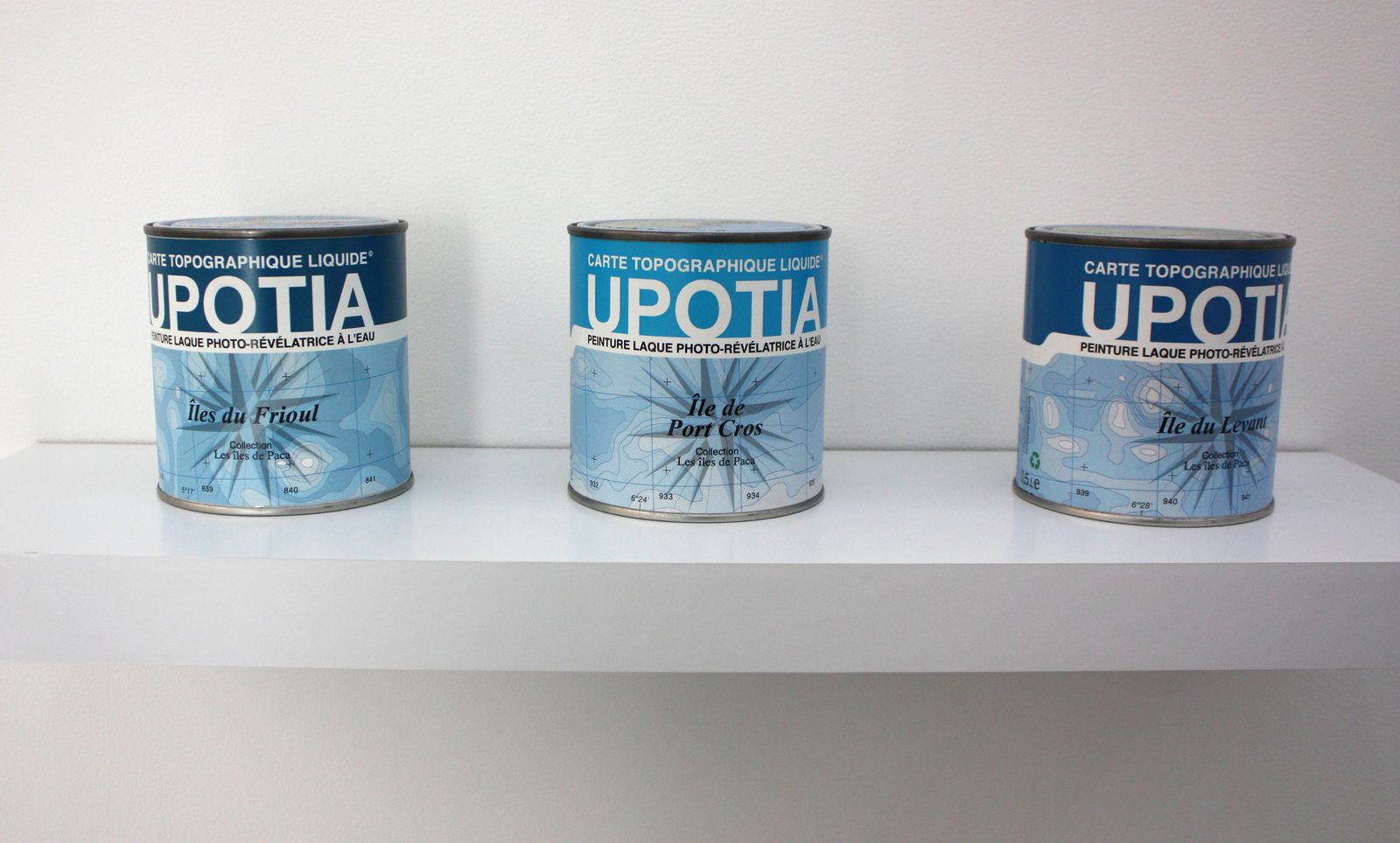 Le dessin des mers et des continents est enseveli sous une couche grise métallique. S’il est visuellement absent, l’esprit ne peut s’empêcher de le retracer mentalement. Une réponse également induite par le contenu mystérieux des pots de peintures de Nicolas Desplats. Upotia suggère l’idée d’une carte liquide, qui, par un truchement de l’ordre du magique, pourrait être appliquée au mur ou au sol.